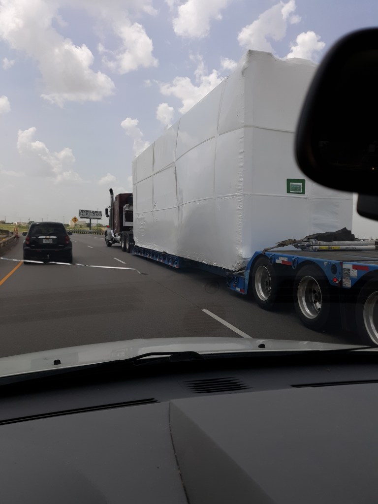 I had plenty of time to contemplate this one. The jerk in front of me wouldn’t pass the truck and I wasn’t about to get stuck by the side of a truck when the driver decided he needed to change lanes and couldn’t see me. My first, and probably best guess, is a huge freaking RV in heavy duty shrinkwrap. Not only because of the size, but the top on the back end. Like a vent, or something of that nature. But it could also be one of those power stations, where people actually go inside to make adjustments. Or something that would never occur to me – and didn’t.