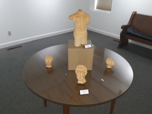 Ellie’s sculptures – on the table are the Three Heads. The one that is now on my desk is on the right.
